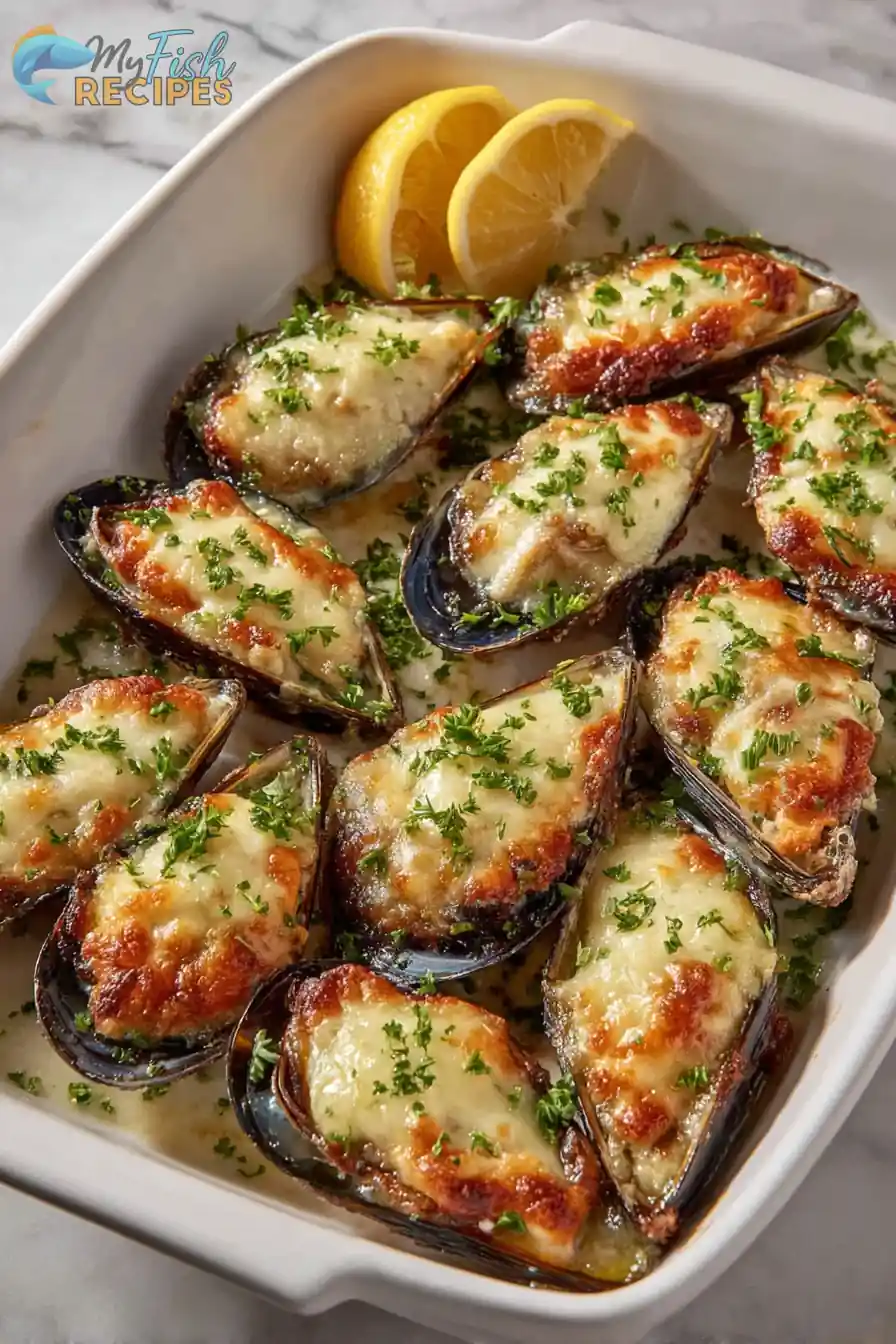 Tender mussels topped with garlicky butter, breadcrumbs, and melted cheese, baked until golden and bubbly for a restaurant-style appetizer or main.